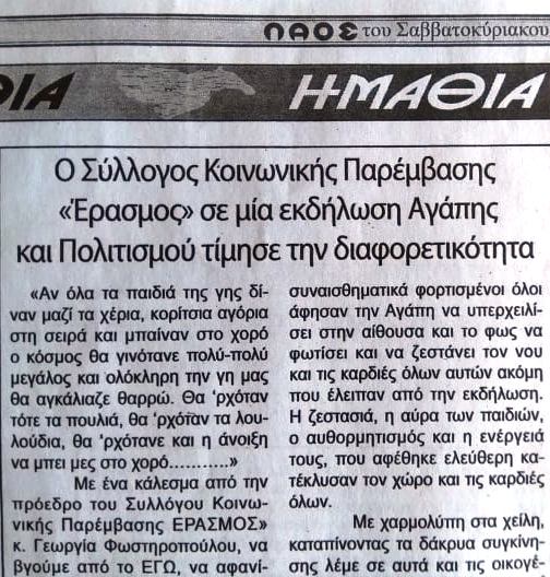 Μια κοινωνική πρωτοβουλία του Συλλόγου Κοινωνικής Παρέμβασης "Έρασμος" Στους καταστατικούς σκοπούς του Συλλόγου Κοινωνικής Παρέμβασης «ΕΡΑΣΜΟΣ» είναι η ευαισθητοποίηση και