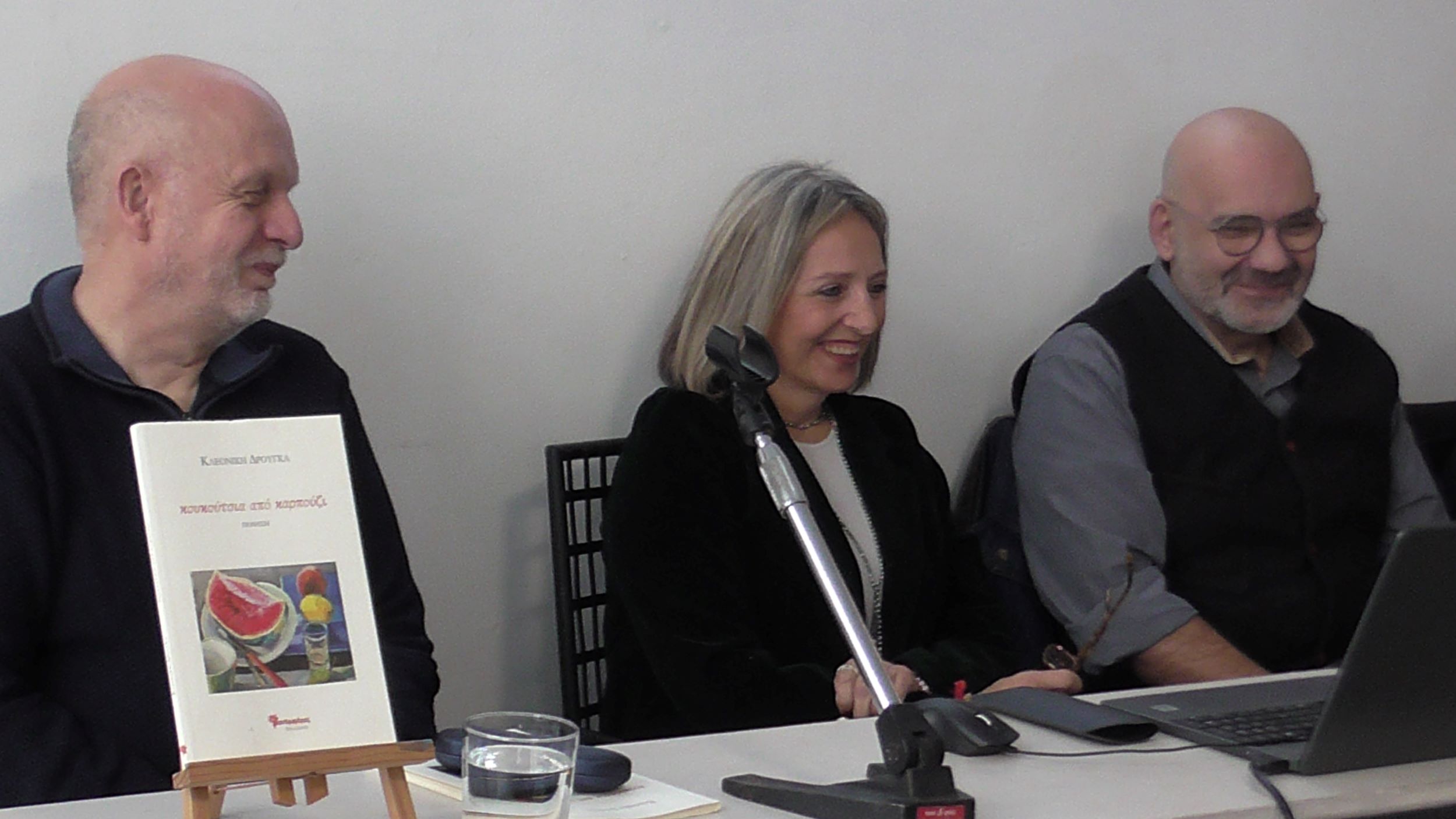 Μια ιδιαίτερης ποιητικής γραφής και αισθητικής απόχρωσης συλλογή, της Κλεονίκης Δρούγκα, «Κουκούτσια από καρπούζι» των εκδόσεων «Μανδραγόρας», παρουσίασε το πρωί της Κυριακής 30 Νοεμβρίου 2025, ο Σύλλογος Κοινωνικής Παρέμβασης «Έρασμος», στη «Γκαλερί Παπατζίκου – Εκτός Χάρτη» , στον απόηχο της 25 Νοέμβρη – Παγκόσμιας Μέρας για την Εξάλειψη της βίας κατά των γυναικών.