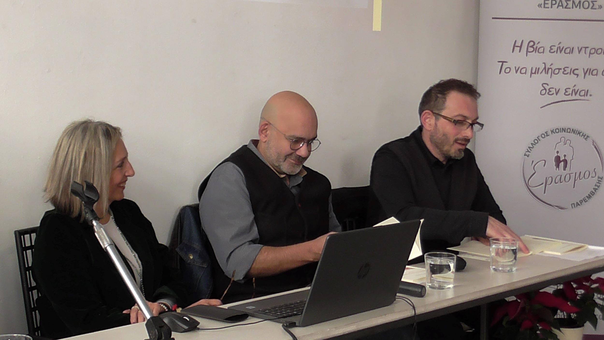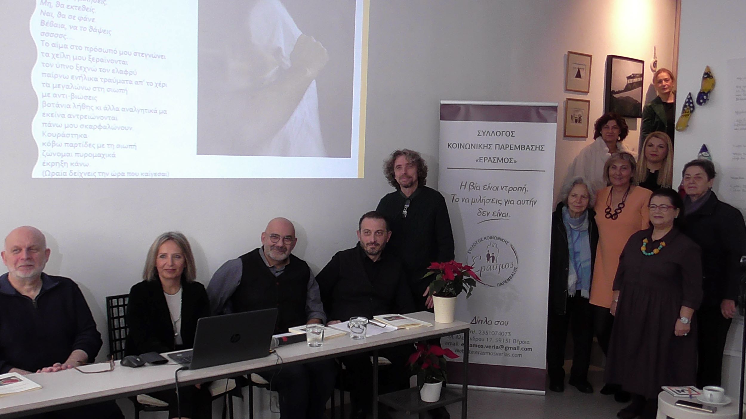 Εκ μέρους της προσωρινής Διοικούσας Επιτροπής του «Έρασμου», την εκδήλωση προλόγισε η Αντιπρόεδρος Αφροδίτη Καλαϊτζή, αναφερόμενη, με αφορμή και τη φετινή 25 Νοέμβρη, στη σύνδεση του έργου της δομής με τη δύναμη και την απήχηση της Τέχνης, αναφέροντας μεταξύ άλλων: «…«Κουκούτσια από καρπούζι». Λέξεις και φράσεις – μυστικά κλειδιά της τέχνης του λόγου, που κωδικοποιούν αλήθειες, που αγγίζουν πτυχές του προβλήματος της έμφυλης βίας. Πόσο μάλλον όταν μια εκδήλωση σαν τη σημερινή λαμβάνει χώρα στον απόηχο του εορτασμού της 25 Νοέμβρη, Διεθνούς Μέρας για την Εξάλειψη της Βίας κατά των γυναικών.