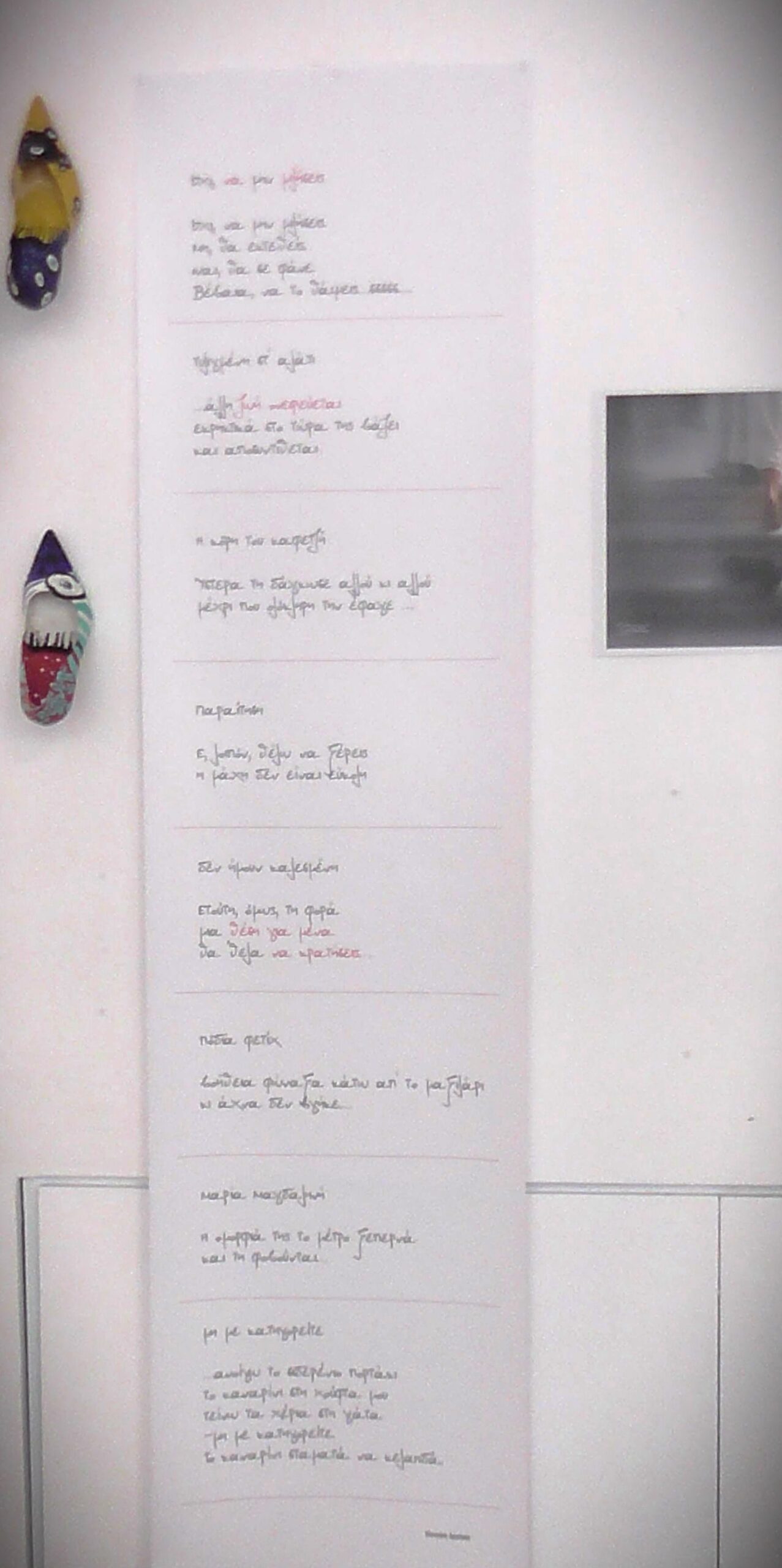 Στην ίδια συνάφεια, η γκαλερίστα Βίκυ Παπατζίκου, ιδιοκτήτρια και «οικοδέσποινα», προσφέροντας την άνεση αλλά και τη λειτουργικότητα, με τη «ζεστασιά» της υποδοχής και της φιλοξενίας, επένδυσε το χώρο της παρουσίασης, όπως πάντα, σχεδόν «σκηνογραφικά» με ιδιότυπες και πρωτότυπες αναρτήσεις στίχων της ποιητικής συλλογής, όπως και δεκάδων αντιπροσωπευτικών έργων έγχρωμου και ασπρόμαυρου φωτογραφικού υλικού, εξαιρετικά ρεαλιστικών απεικονίσεων, θεματικής σχετικής με τη γυναικεία κακοποίηση, από το φακό των Φωτογράφων Δέσποινας Αποστολίδου και Στέλιου Κατερίνη.