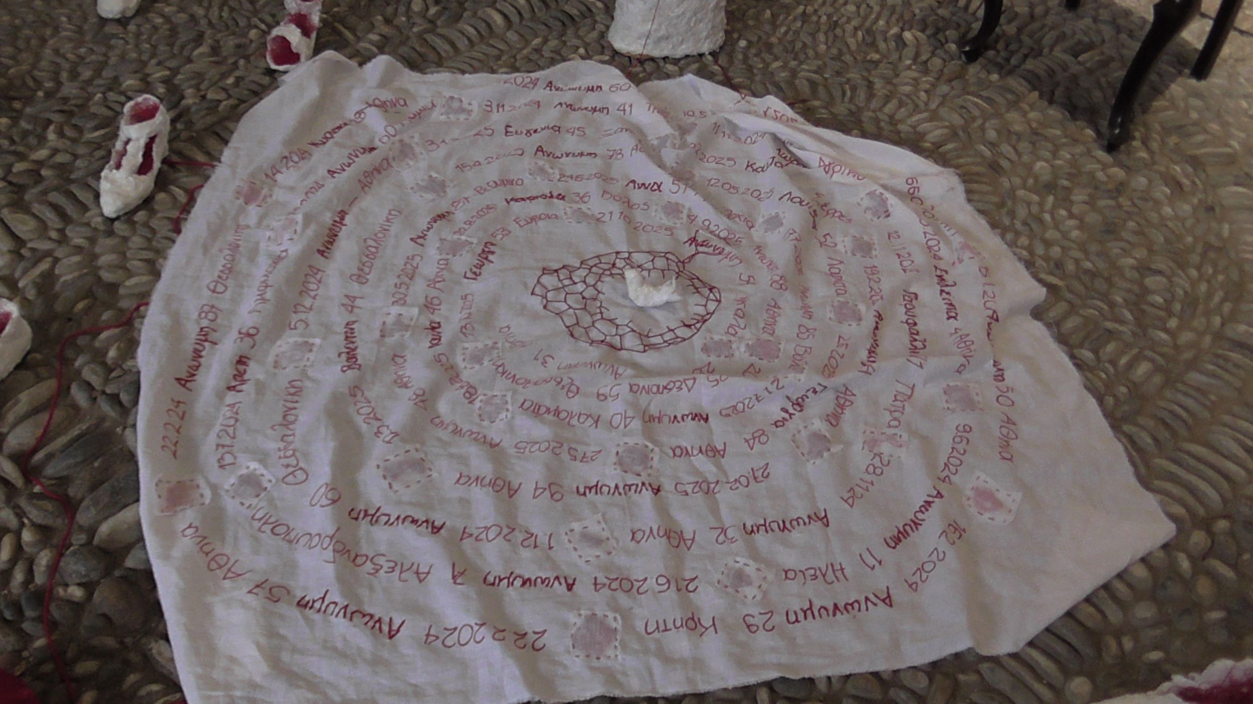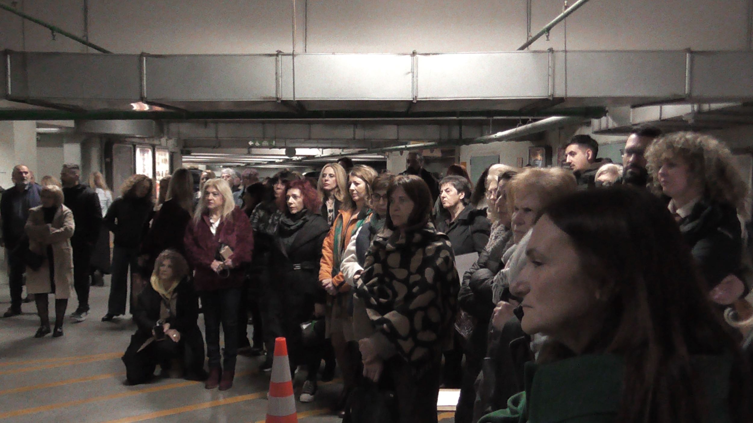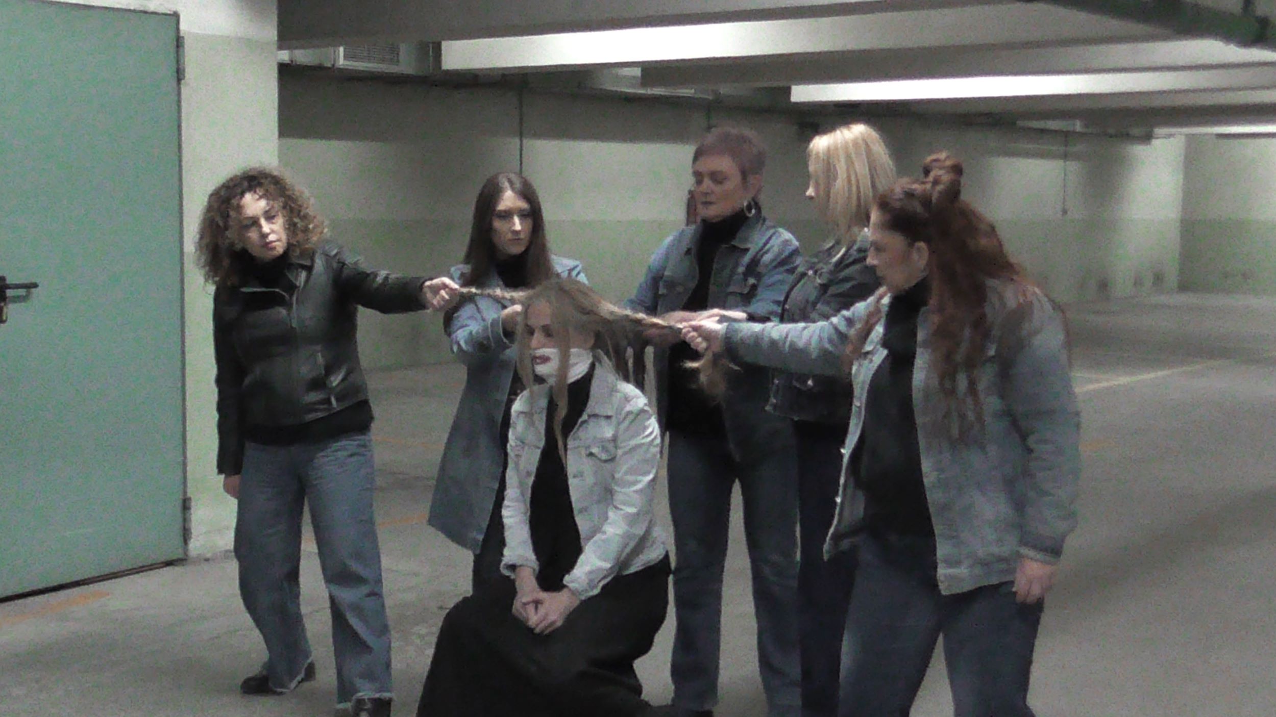 Ακολούθως στο Υπόγειο του Parking της Πλατείας Δημαρχείου, η Εικαστικός Κατερίνα Αναστασίου παρουσίασε το video art «κατάλοιπο» και την Performance «Πλεξούδες Σιωπής», διερευνώντας την κληρονομιά των έμφυλων ρόλων και τις κοινωνικές προσδοκίες που συνοδεύουν τη γυναίκα στον χρόνο. Μέσα από την επανάληψη μιας ατέρμονης χορογραφίας σε ένα οικείο αλλά κλειστοφοβικό περιβάλλον, κάθε κλωστή γίνεται υποχρέωση και κάθε πέτρα απαίτηση. Στα άνθη και τις πέτρες ο κόπος συσσωρεύεται, ενώ η πιθανότητα αποδέσμευσης εμφανίζεται διακριτικά, σαν μία ρωγμή που επιτρέπει στο νερό να κυλήσει ελεύθερο. Στις «Πλεξούδες Σιωπής», με ορατά σημάδια επιβολής και συλλογικής συμμετοχής στο πρόσωπο,  το σώμα γίνεται πεδίο κοινωνικής κατασκευής και ελέγχου. Τα μακριά μαλλιά, σύμβολο ταυτότητας και θηλυκότητας, πλέκονται σφιχτά, παραπέμποντας στα διαχρονικά χτενίσματα, και στις αιώνιες απαιτήσεις για αξιοπρέπεια, ευπρέπεια και υποταγή των γυναικών. Μέσα από το πλέξιμο, ως χειρονομία πειθαρχίας, αποκαλύπτονται οι αόρατες κοινωνικές πιέσεις που περιορίζουν και διαμορφώνουν τη ζωή του σώματος.  Στο δρώμενο συμμετείχαν οι: Αλεξάνδρα Γκίκα, Κατερίνα Γρηγοριάδου, Ελένη Ντόντου, Υακίνθη Σταμπολή, Γεωργία Ξενοφώντος, Ειρήνη Κουρκούλη και ο Βαγγέλης Τολίκας.