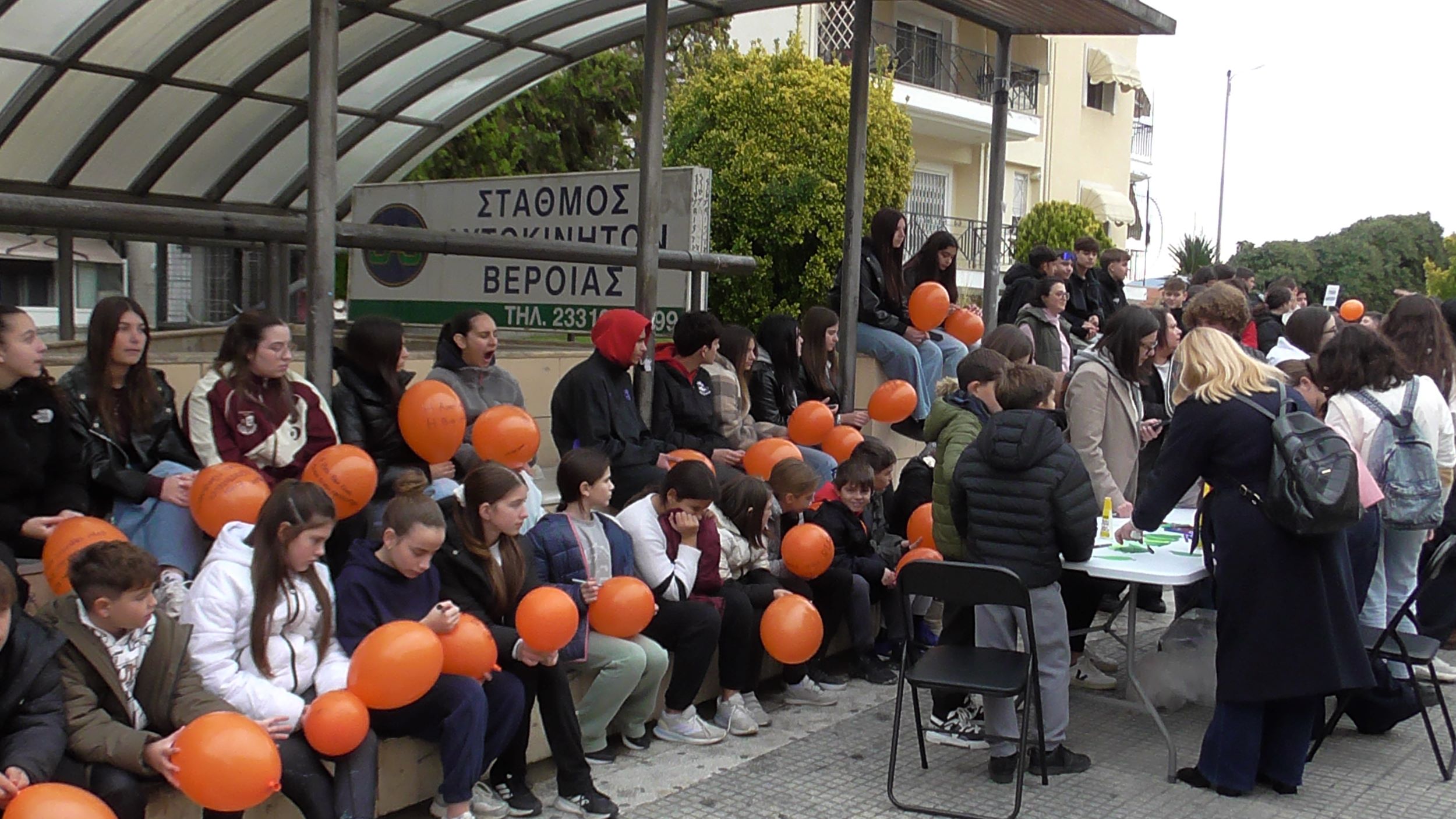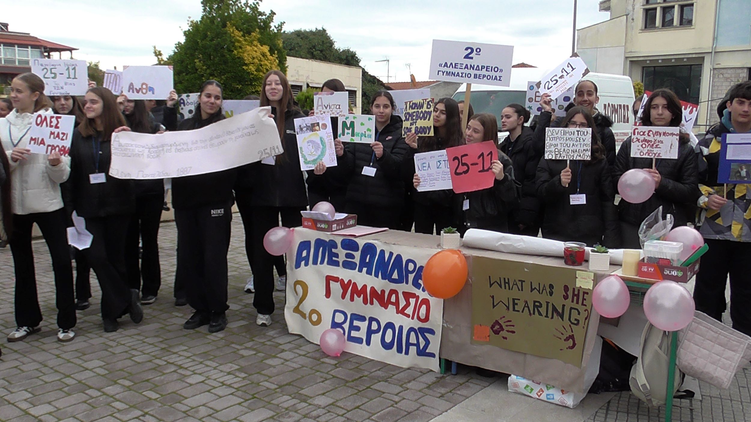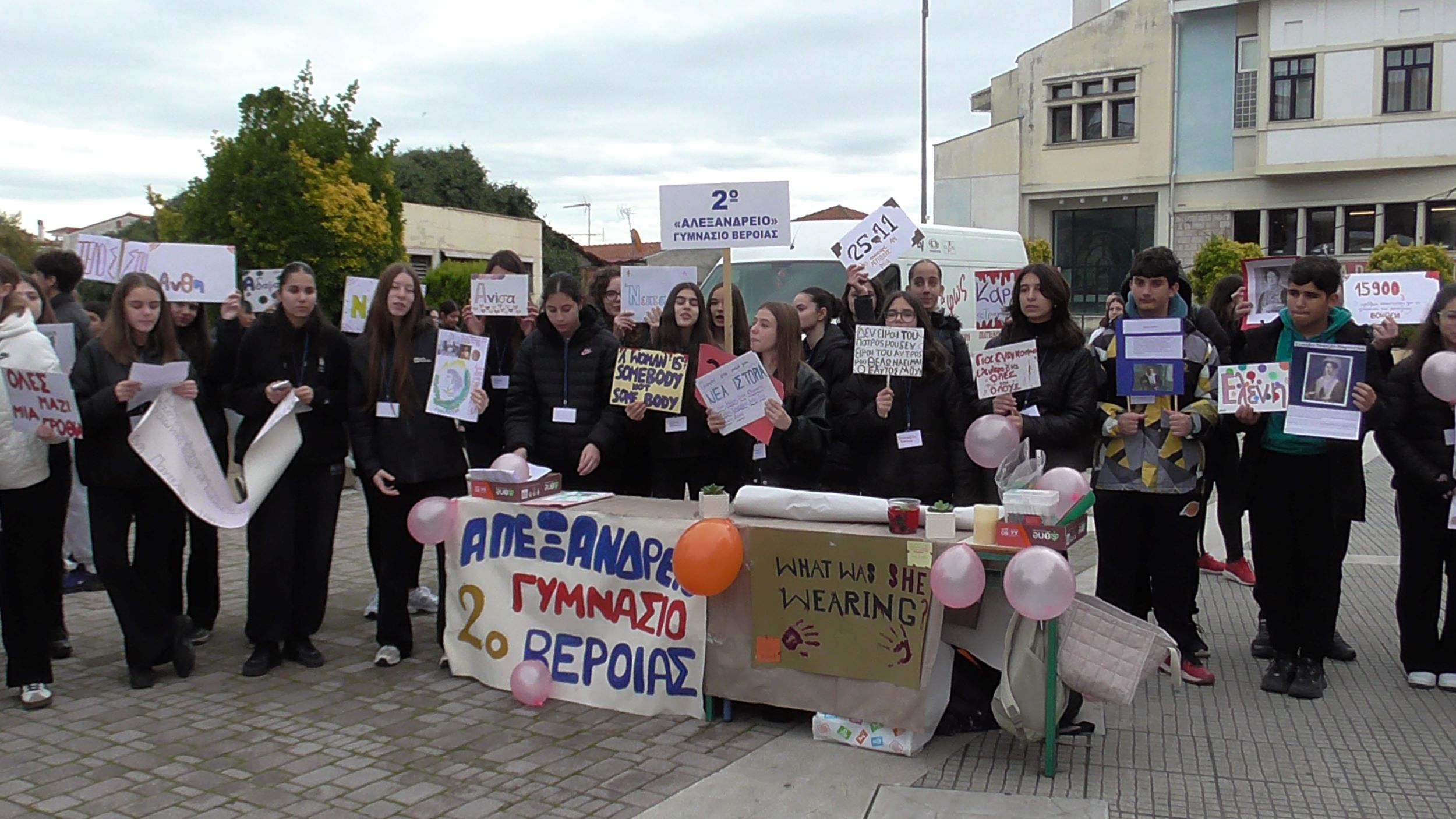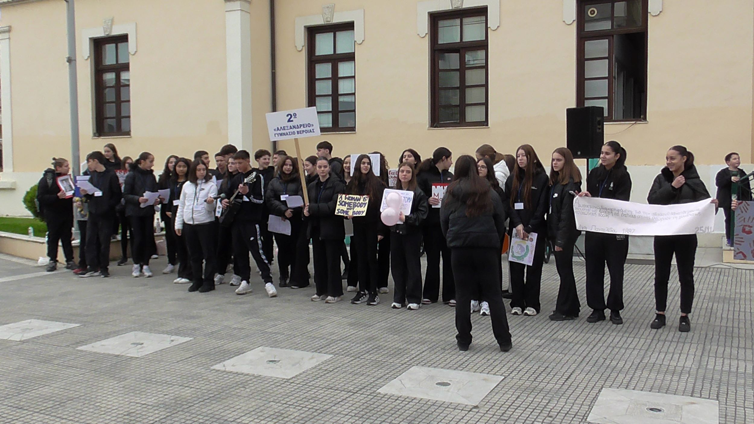 Με εικαστικά και μουσικο-χορευτικά δρώμενα και τη συμμετοχή εκατοντάδων μαθητών σχολικών μονάδων της Ημαθίας, τιμήθηκε η φετινή 25 Νοέμβρη – Παγκόσμια Ημέρα για την Εξάλειψη της Βίας κατά των Γυναικών, το πρωί της Τρίτης στην Πλ. Δημαρχείου Βέροιας, στο πλαίσιο των επετειακών εκδηλώσεων της Επιτροπής Ισότητας των Φύλων του Δήμου.