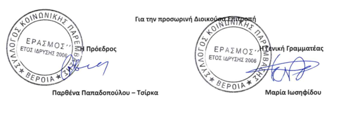 Η υποβολή των αιτήσεων με τα απαιτούμενα σχετικά έγγραφα από τους/τις ενδιαφερόμενους/νες θα γίνεται αυτοπροσώπως ή με εξουσιοδοτημένο γραπτώς από αυτούς/ες άτομο στα γραφεία του Συλλόγου, που βρίσκονται στον τρίτο όροφο της οικοδομής, στη Βέροια και επί της οδού Μ. Αλεξάνδρου 17, 9.00-14.00 καθημερινά, εκτός Σαββάτου και Κυριακής και ηλεκτρονικά στο email: erasmos.veria@gmail.com και σε κάθε περίπτωση, για πληροφορίες η επικοινωνία μπορεί να γίνει στο τηλέφωνο 23310 74073.